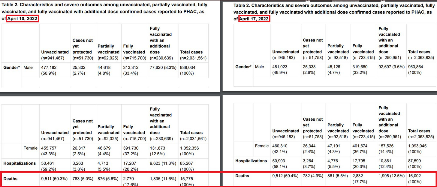 🇨🇦 Canada’s jab numbers aren’t looking too good. When comparing the official April 10th report to the April 17th report, we discover some disquieting figures in the deaths totals: