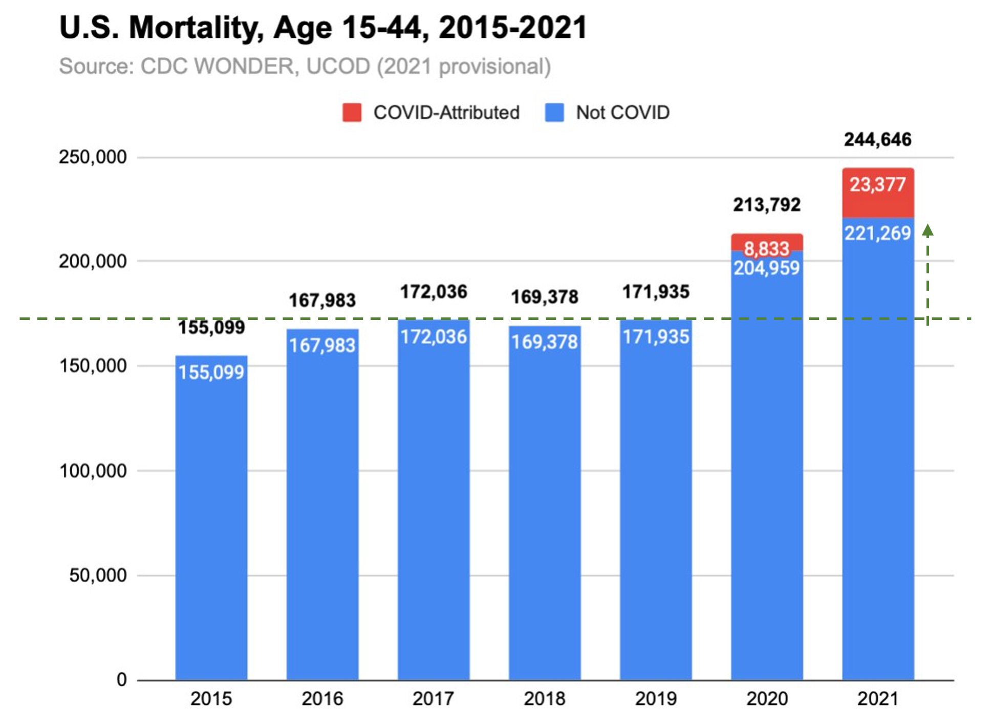 📈 US mortality data is also starting to show some unsettling signals. For one, NON-COVID mortality among ages 15-44 was over FORTY PERCENT HIGHER in 2021 than 2019, even WITH vaccines and treatments and a year of experience with covid. Excess non-covid deaths are significantly higher than the total covid deaths. Weird. I wish we had a multi-billion dollar government agency that could look into things like this and figure out what’s going on.