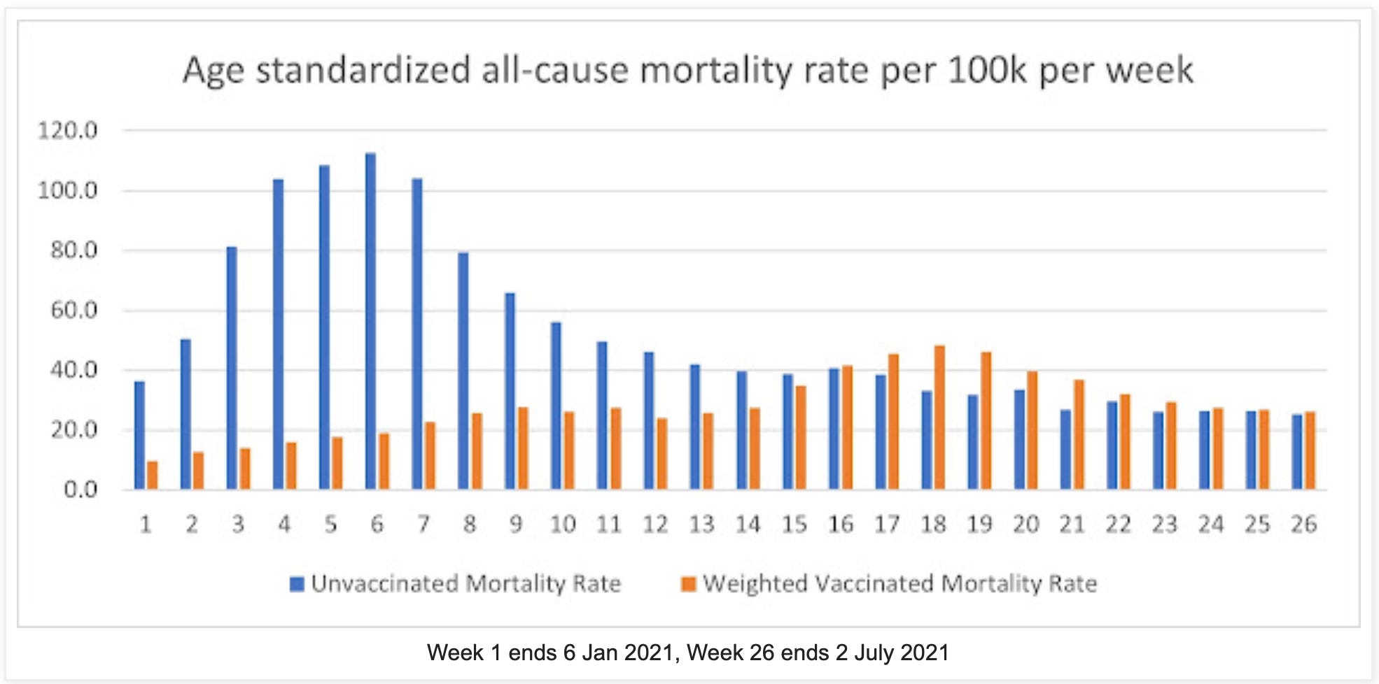 The first chart shows “that, over time, the weighted mortality rate for the vaccinated has steadily increased and by week 16 (23 April 2021), surpassed that for the unvaccinated.” Oh.