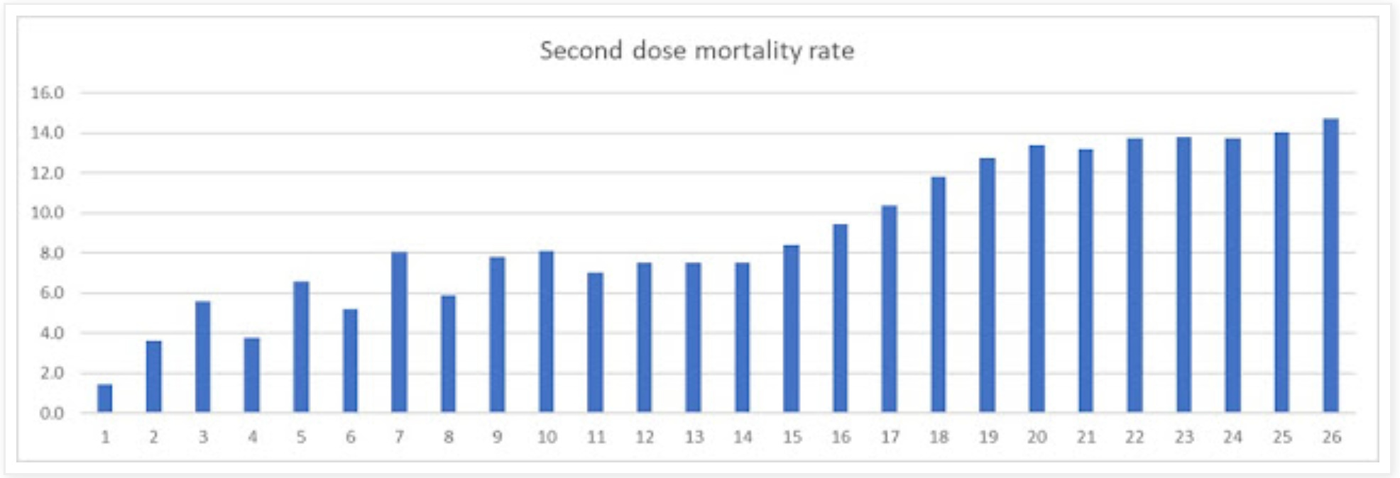They concluded: “Since 19 March, the double dose vaccination mortality rate has increased week-on-week more or less consistently. The mortality rate for those more than 21 days after first dose increased drastically in the spring (at week 14) and remained high thereafter.”
