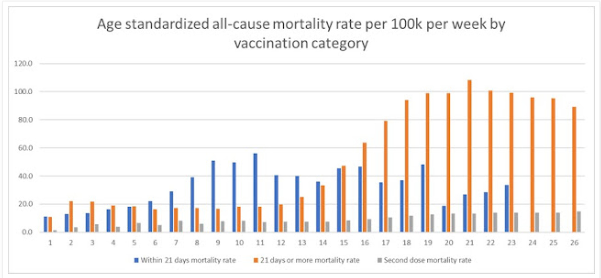 The third chart shows “the mortality rate, for week 26, up to 2 July, for the unvaccinated is around 25 deaths per 100,000. But there are big differences between the mortality rates for the different categories of vaccinated deaths. For example, for those after 21 days of first dose, the comparable mortality is around 89 deaths per 100,000 people (a number which has drastically increased since January), while for those vaccinated with two doses there were approximately 15 deaths per 100,000 in the same July period.”