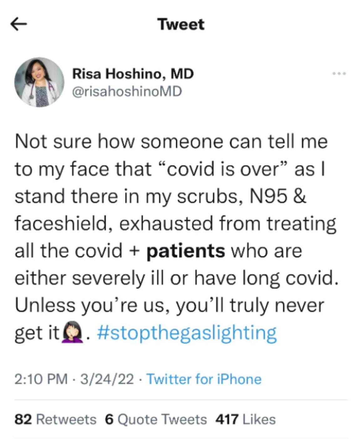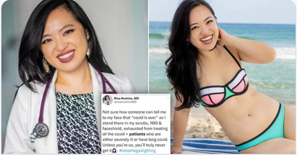 The “expert” in question was Risa Hoshino, MD, who spent most of the pandemic online touting herself as an exhausted frontline health care worker, public health and virus-science expert, and social media warrior. Right up until this month, she has been constantly posting alarming covid fear porn like this March 24th bon mot: “Not sure how someone can tell me to my face that ‘covid is over’ as I stand there in my scrubs, N95 & face shield, exhausted from treating all the covid+ patients who are either severely ill or have long covid. Unless you’re us, you’ll never get it. #stopthegaslighting.”