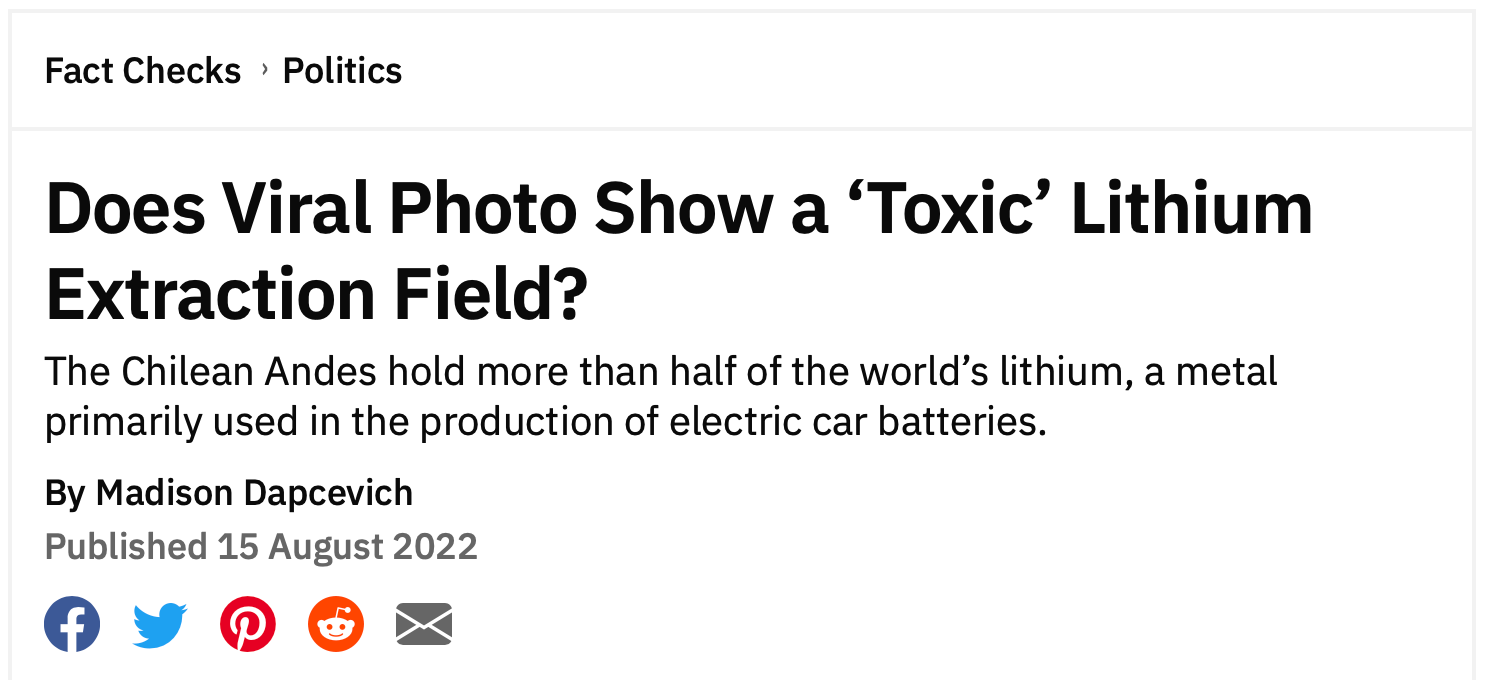 They rated it “Mixture?” Hahahahaha! It’s not “false.” It’s not false because “there IS evidence lithium leach fields can be damaging to the environment,” so there’s THAT. But it’s even worse; Snopes was FORCED to admit that lithium ALSO “poses potential health threats to both birds and humans.” You know they tried REALLY HARD to avoid conceding that one.