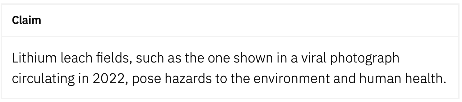 All that sounds pretty much like the claim should be marked “true.” But Snopes just can’t admit it’s true, because that would hurt electric car sales. Instead, they engage in the logical fallacy of an appeal to ignorance: “the scientific literature is limited and data is not widely available.” So … we’re just dumping this toxic metal in the ground and just HOPING it doesn’t wipe out the aquifer and all the animals, birds, and humans. Brilliant! Thanks experts!