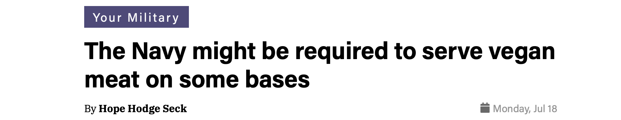 Think I’m crazy? Think it could never happen? Think people would never stand for a fake meat mandate? You’re wrong. Where do they always start these things? The MILITARY: