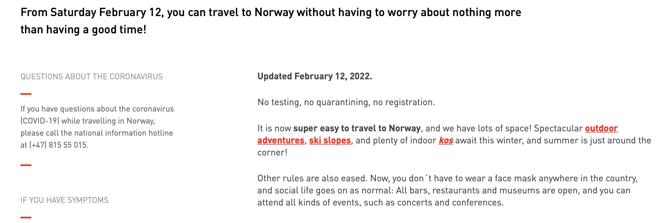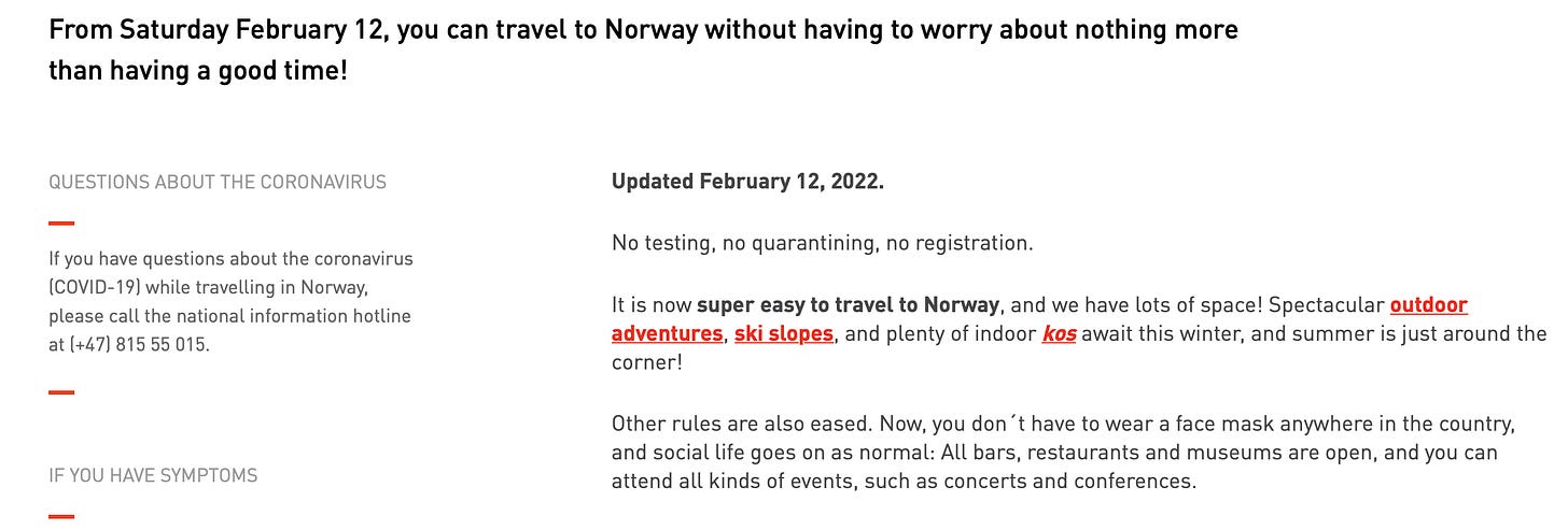 🔥 Norway scrapped its final Covid restrictions yesterday, despite being in the middle of an Omicron surge. Who cares about cases! Norwegians can now look forward to seeing faces, no mask requirements between the hostess stand and the table in restaurants or anywhere else, no more social distancing, and no more self-isolating requirements.