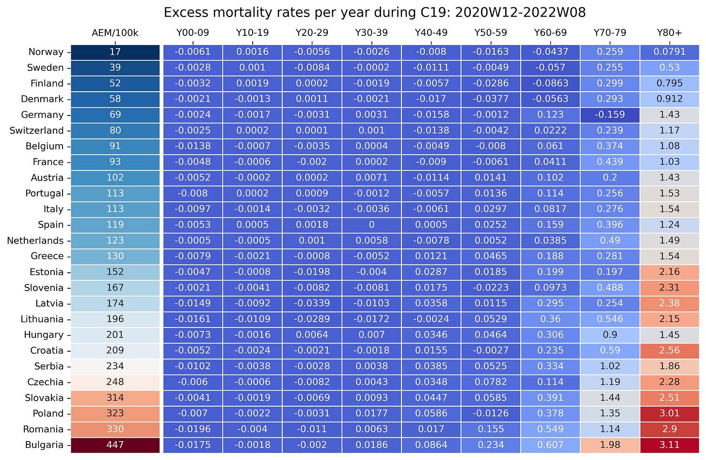 It’s Sweden! Only frigid Norway has lower excess deaths. It sure makes for a weird correlation between lax enforcement of covid requirements and survival. And Bulgaria — one of the strictest enforcers of lockdowns, digital passports, and mandated vaccination — has the HIGHEST excess mortality in Europe.