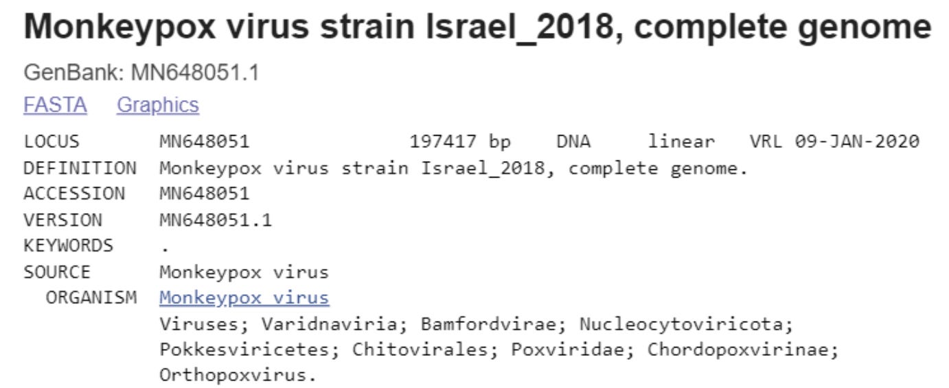 Scientists can describe the DNA of a virus using letters and numbers once the virus has been “sequenced.” They keep an online database of all sequenced germs, so it is easy to search for a match once you have a new bug’s code. This is helpful because they can easily find similar germs, or germs with parts that match parts of a current bug of interest. Here, independent researchers are saying that European monkeypox is a 99.9% match for this Israel_2018 virus.