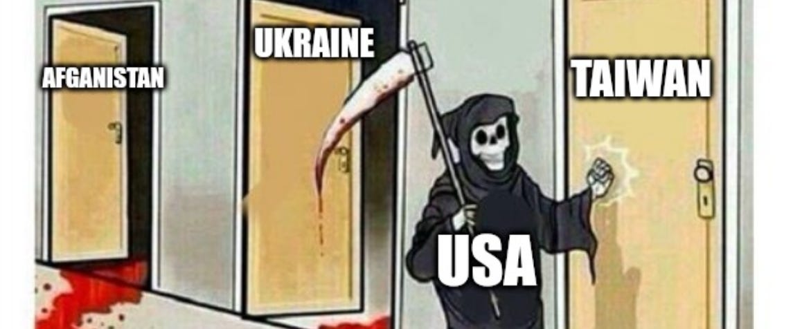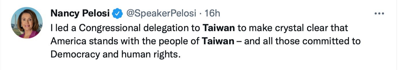 Great. So I guess the U.S. needs to show up with something tangible that the Taiwanese could use pretty soon, like an army or something, or maybe the Pelosi trip is enough support by itself. What do you think? Someone criticized me in the comments yesterday for not recognizing how Pelosi’s visit was super important so we could show the Chinese they can’t boss us around. Mission accomplished, but has the analysis changed any now that Taiwanese are about the endure what — at best — is going to be a painful and inconvenient interlude?