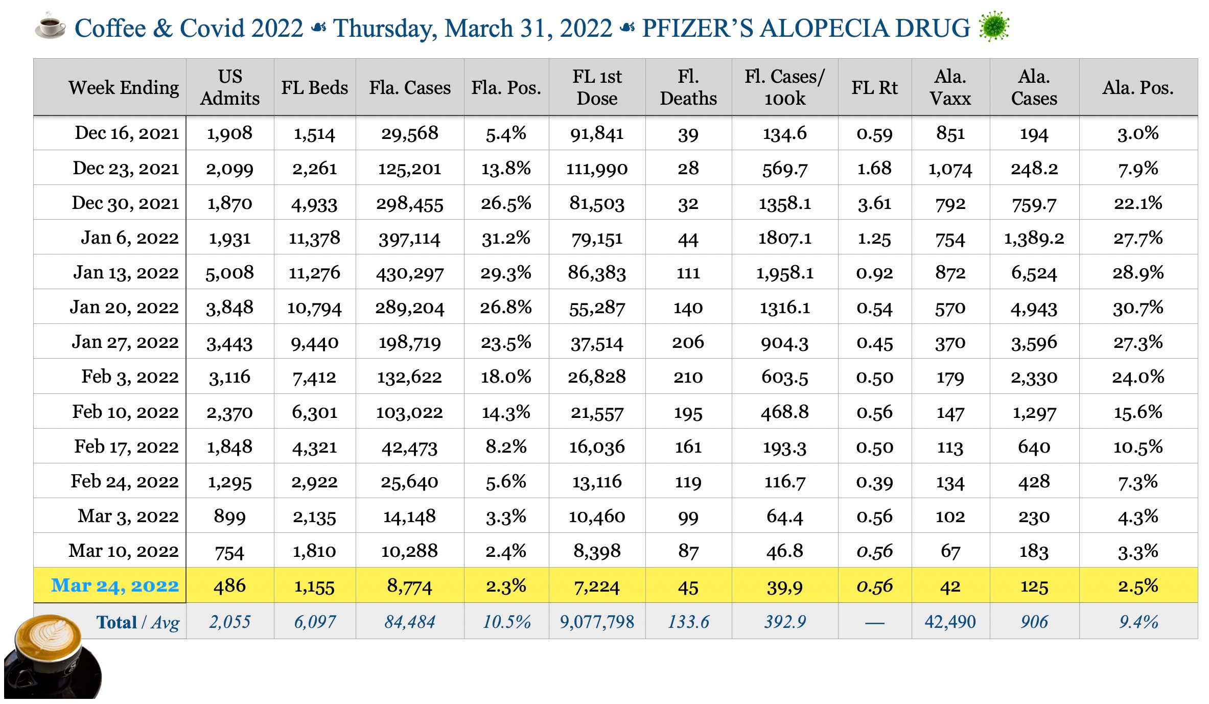 ☕️ Coffee & Covid ☙ Thursday, March 31, 2022 ☙ PFIZER’S ALOPECIA DRUG 🦠