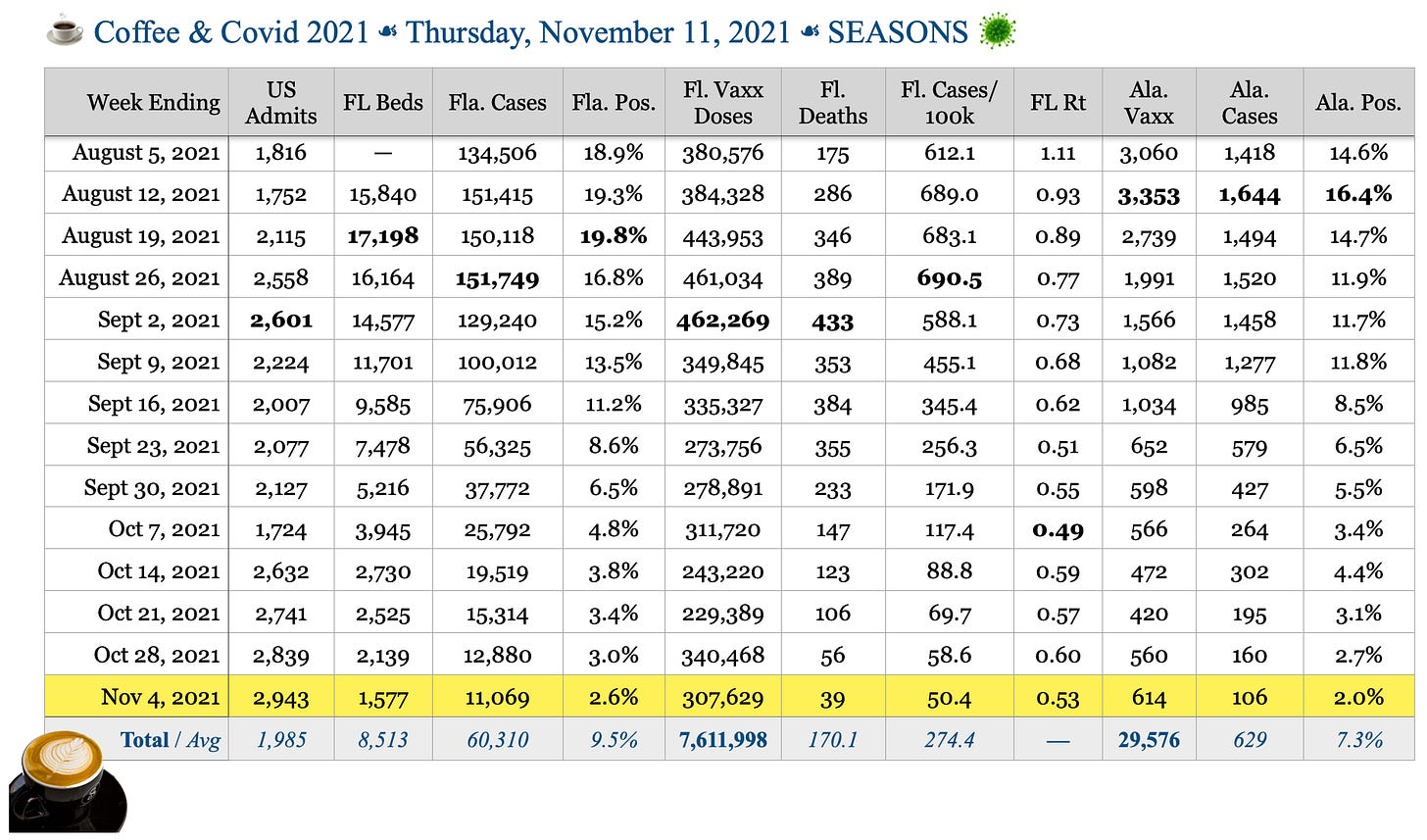 ☕️ Coffee & Covid ☙ Thursday, November 11, 2021 ☙ SEASONS 🦠