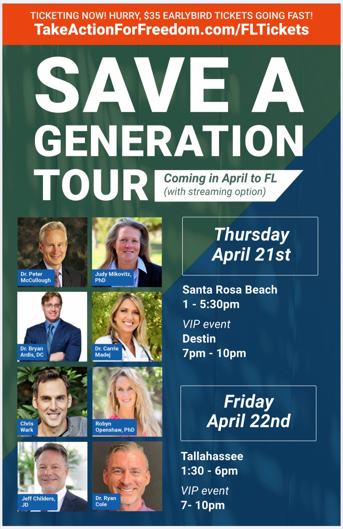 🪖 I don’t need to tell you that the war to lift mandates and keep them off kids and the rest of us isn’t over yet. So I’m not sitting still, and you might be interested in several upcoming events on the “Save A Generation 7-City Tour.“ I am told there are tickets still available ($35), including virtual tickets.