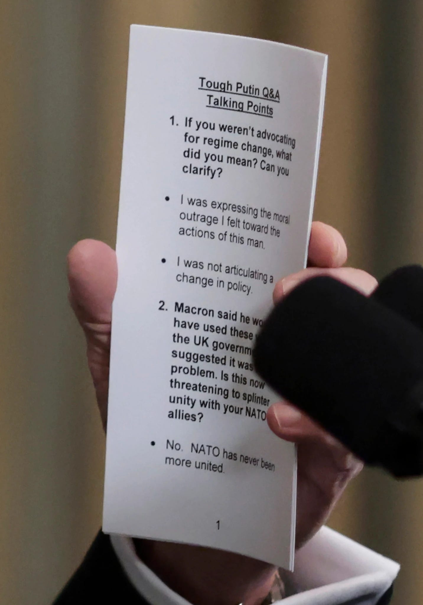 But one of the camera angles revealed a pocket card that Joe was holding in his hand while speaking. Under the heading “If you weren’t advocating for regime change, what did you mean?,” it suggested Biden say “I was expressing the moral outrage I felt towards the actions of this man.”