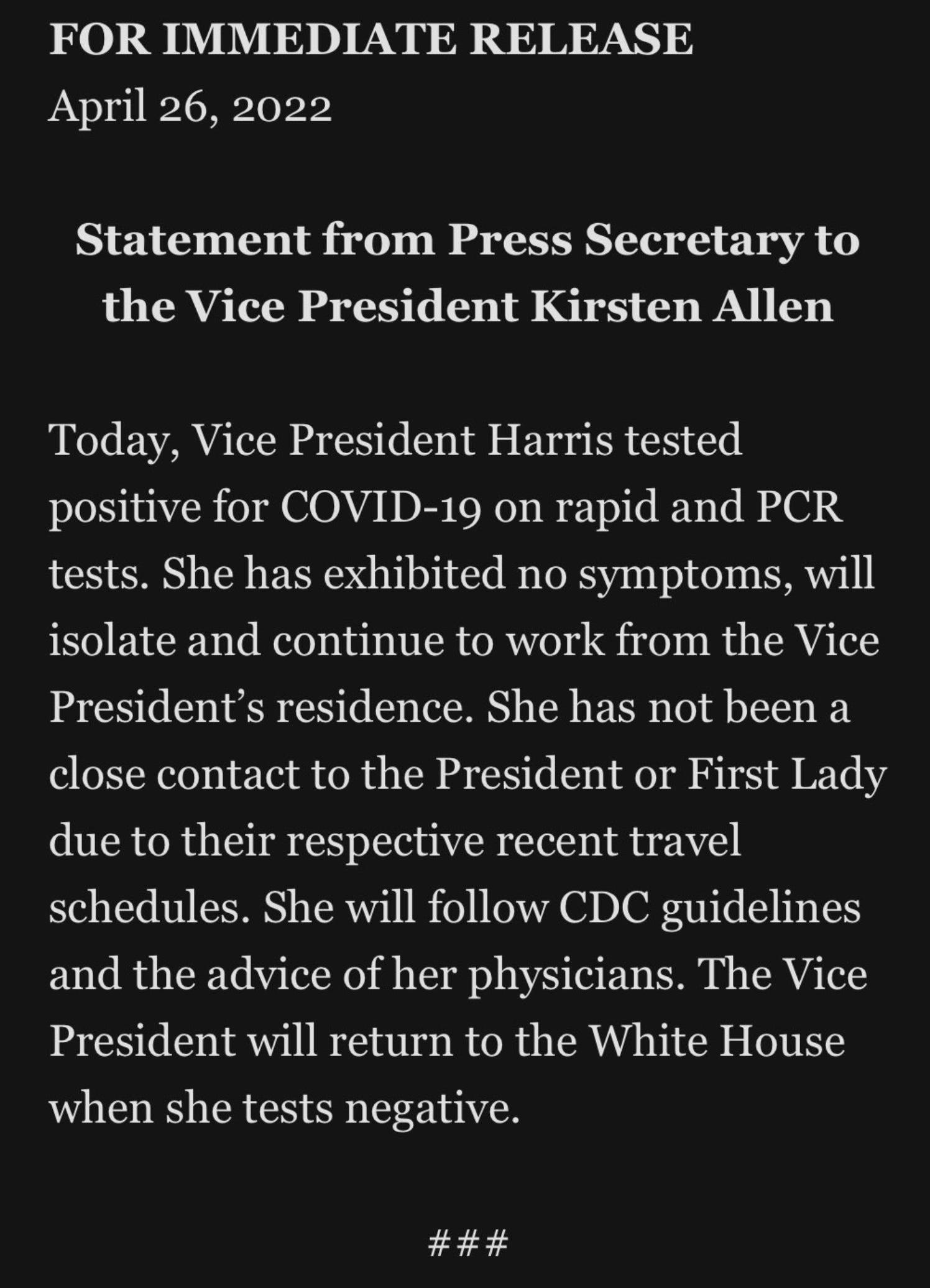 💉 Quadruple-jabbed Vice-President Kamala Harris has now tested positive for covid. She said the words, though: “Today I tested positive for COVID-19. I have no symptoms, and I will continue to isolate and follow CDC guidelines. I’m grateful to be both vaccinated and boosted,” Harris tweeted yesterday afternoon.