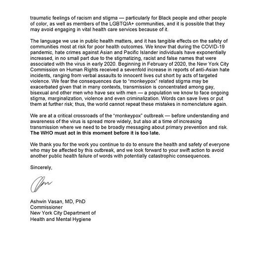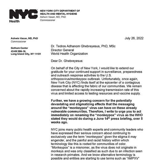 According to the NYC-DOH, if the W.H.O. would be kind enough to call monkeypox something else, something BETTER, something more AFFIRMING and less stigmatizing, then the unpleasant possibility of racist-homophobic-white supremacist inferences could be checked off the list, and then the Department of Health could get on with doing something about the actual outbreak, something practical. Until then, what are they supposed to do? Their hands are tied by invidious racism.