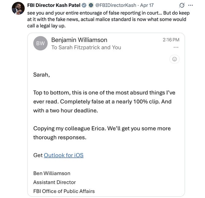 You forgot the part where Kash casually dropped the "2020 election fraud arrests are coming" hammer. Hmmmmm. ;) https://jennasside.rocks/p/kash-patel-sues-the-atlantic-over