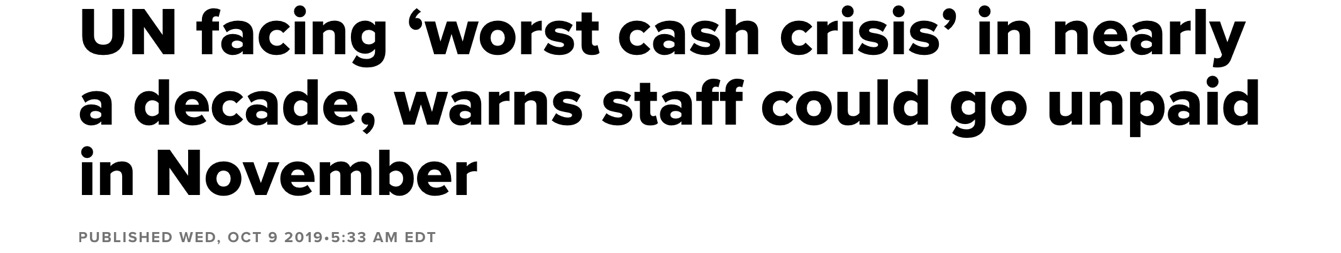 🔥 Needless to say, the US pitches in more than any other country in the world. Dues are pegged to each country’s relative wealth; it’s sort of like a wealth tax. Republican Congresses have been stingy before. Cyclical cash squeezes, anchored in U.S. arrears, are a well-known phenomenon that began in the 80’s. It last hit critical levels during Trump 1.0. Headline from CNBC, October 2019:
