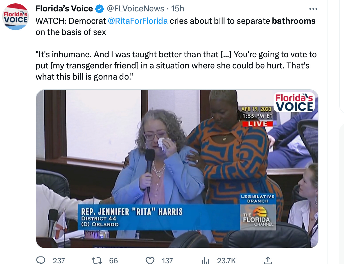 It was so horrible that representative Jennifer Harris (D-Orlando) sobbed uncontrollably at the thought of Florida’s continuing bathroom rules in place since 1887: