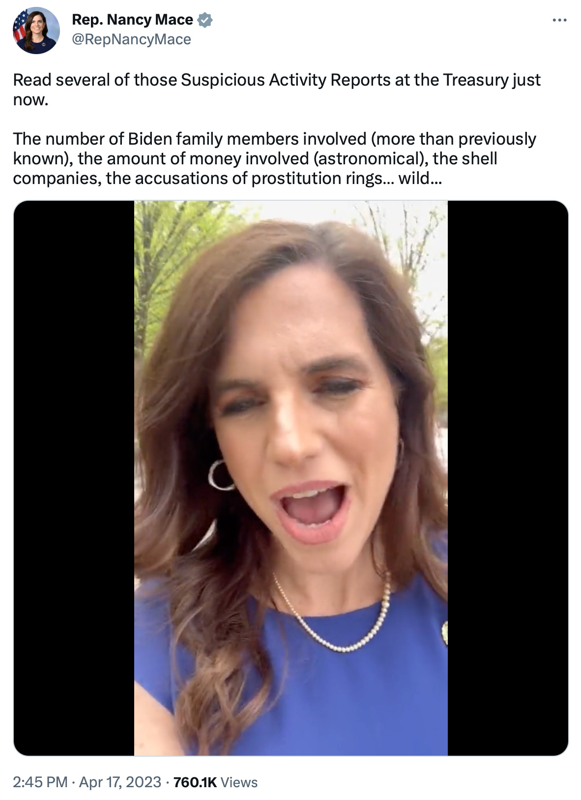Committee member Nancy Mace (R-SC), described the amount of money involved in the latest investigation as “astronomical,” and hinted that the Biden family interests included “prostitution rings:”