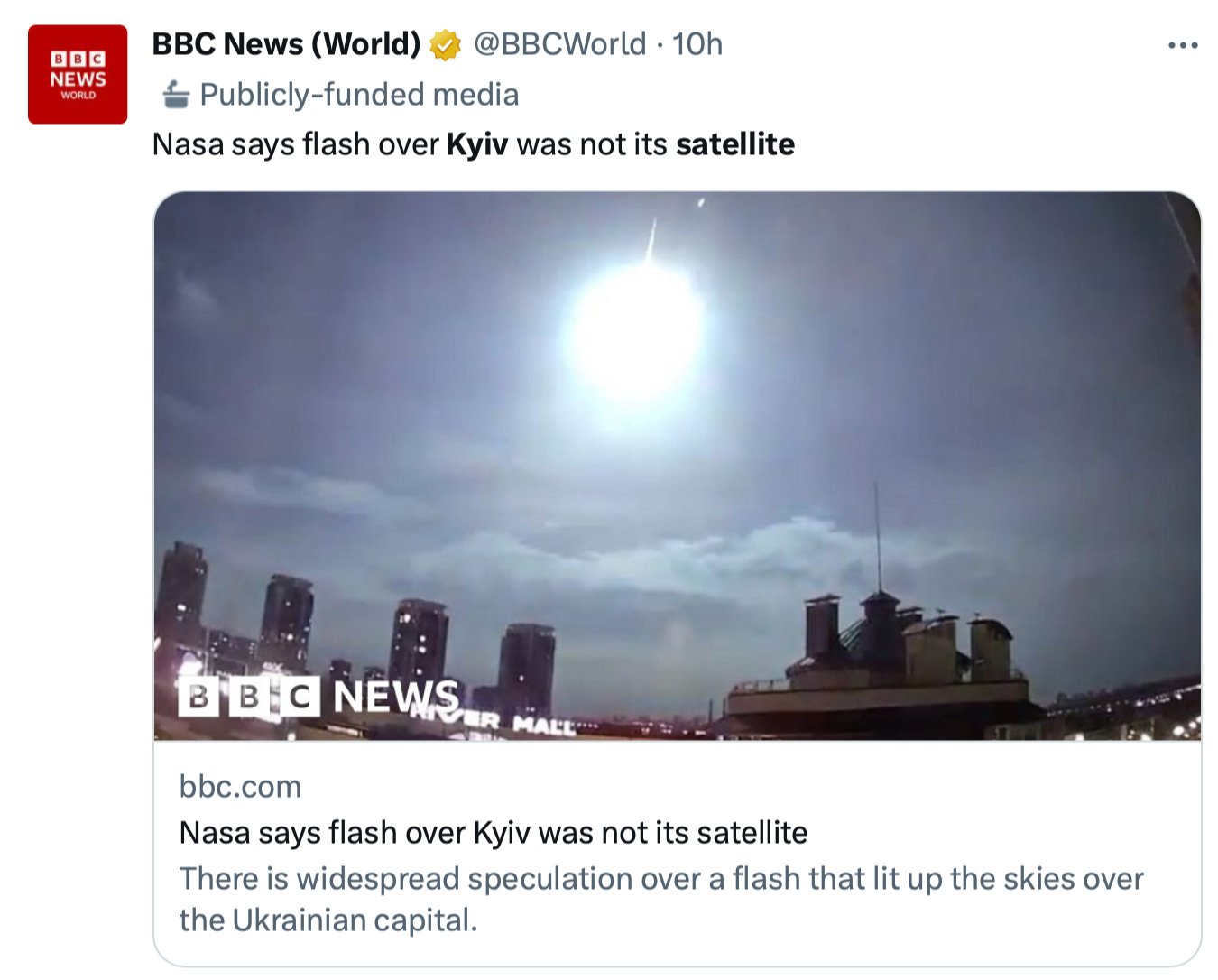 According to government-funded BBC, Ukrainian officials later changed their story, and said the explosion was caused by a meteorite. ANOTHER meteorite. It’s weird, since a different meteorite just exploded over Israel this weekend, as I reported on Monday.