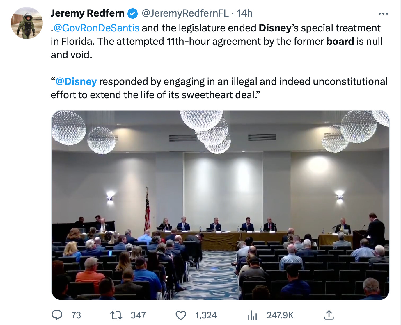 Furthermore, lawmakers quickly filed House and Senate floor bills allowing the development agreement to be voided by the new board, which is now known as the Central Florida Tourism Oversight District. So Disney is going to have the problem of defeating the new statute as well as proving its sneaky agreements were properly handled.