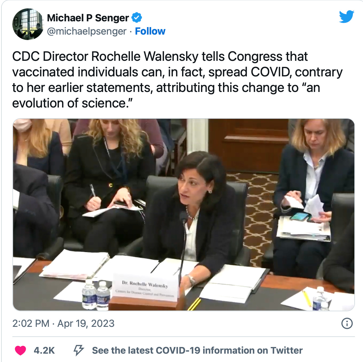 💉 The Science has been drinking again, but — trust the government — you can still believe it. In Congressional testimony yesterday, CDC Director Rochelle Walensky finally admitted that the jabs do NOT prevent transmission after all, and blamed her shifting statements about the issue on “evolving science” plus an evolving virus.