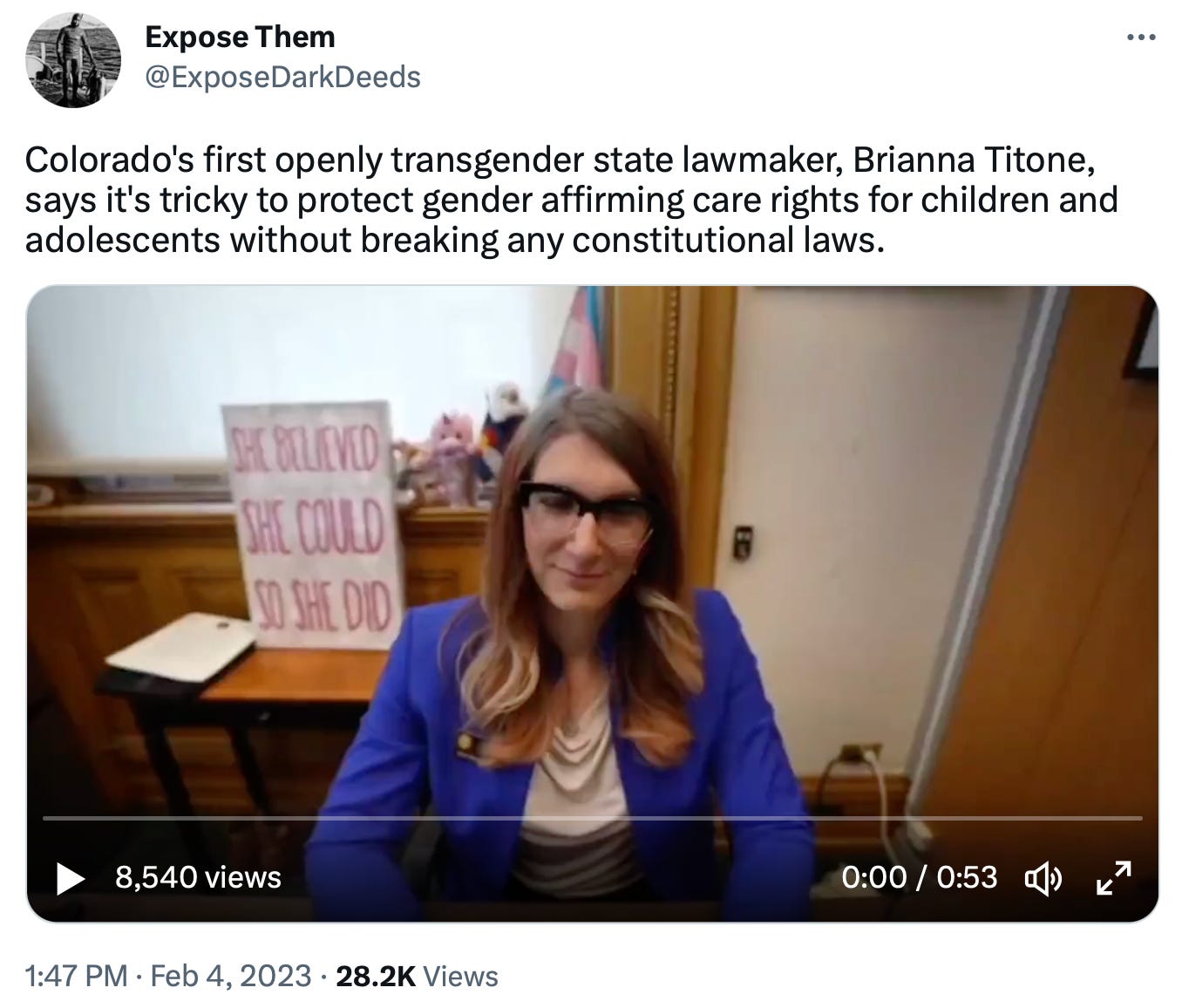 The bill was sponsored by Colorado’s first openly cross-dressing lawmaker, representative Brian “Brianna” Titone (D-27). I did not make that name up. Brian has a nice, deep voice.