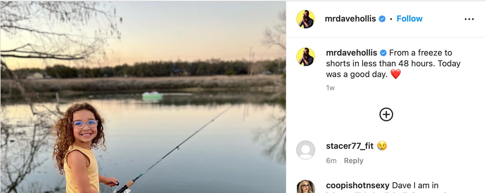 Hollis had a podcast and taught self-help seminars. Recently divorced, he leaves four children, and ten days ago, Hollis posted an instagram of his daughter Noah fishing: