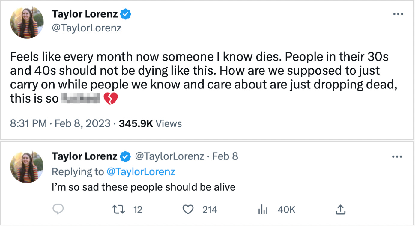 She’s exactly right. People in their 30s and 40s should NOT be dying like this. My best guess is Taylor just got word of yet ANOTHER young person she knows who died suddenly, and in her grief turned to Twitter.