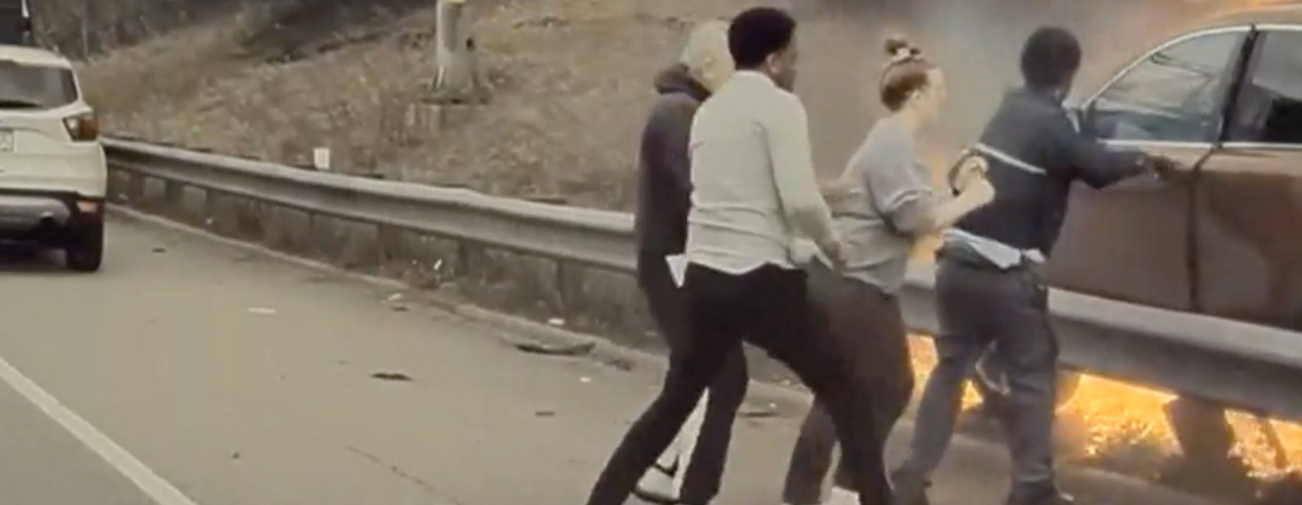 The trouble was that the highway guardrail blocked the driver-side door. The bystanders — all strangers to each other — bravely worked together as the flames grew higher and stronger, scorching them and pushing them back, but they persisted in trying to bend the guardrails and get the door open before it was too late.