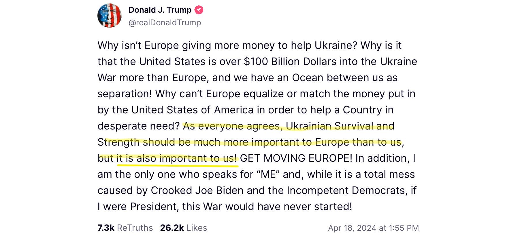 Inexplicably, President Trump has failed to mention Speaker Johnson at all in his most recent Truth Social posts, even ones about Ukraine aid. Instead, he’s complained only about the U.S. having to shoulder the whole burden — and oddly recently remarked that “everyone agrees … Ukrainian survival is … important to us”: