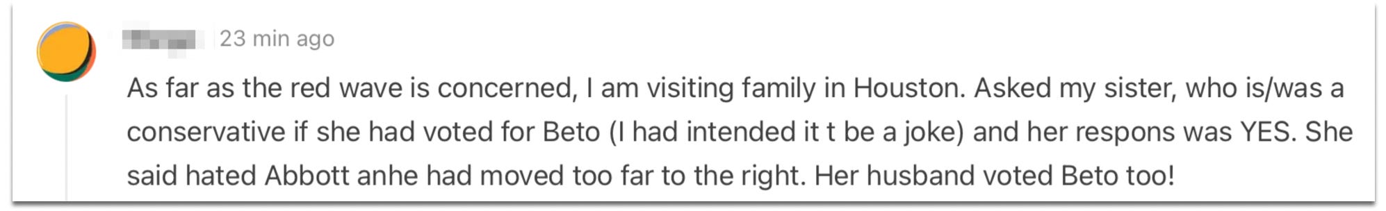 So there is definitely a trend, maybe not as big a shift as dems leaving their party, for reasons I don’t completely yet understand, some R’s also drifted toward the blue during the pandemic.