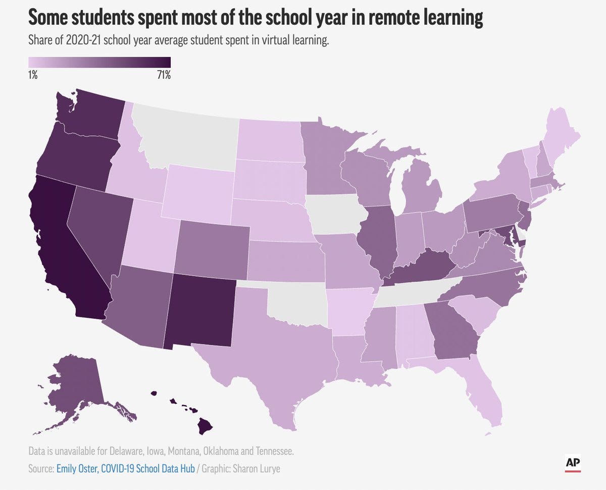 For example, from March 2020 to June 2021, the average student in Chicago lost 21 weeks of learning in reading and 20 weeks in math, equivalent to missing half a year of school. Nationally, kids whose schools met virtually in the 2020-2021 school year performed on average 13% worse in math and 8% worse in reading, compared with schools that met in person, according to recent a study by the aforementioned Professor Emily Oster.