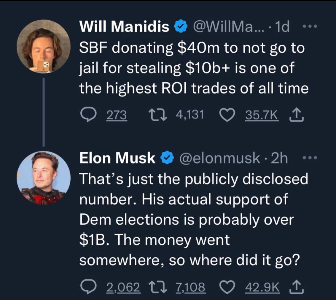 🔥 For what it’s worth, Musk alleged this week that Sam Bankman-Fried may have donated up to $1B of other people’s money to democrats — far more than what was publicly disclosed. If true, it would strongly suggest that FTX was never meant to survive, but just to funnel money to the democrats during the elections, leaving the firm’s inevitable collapse as a problem for later.