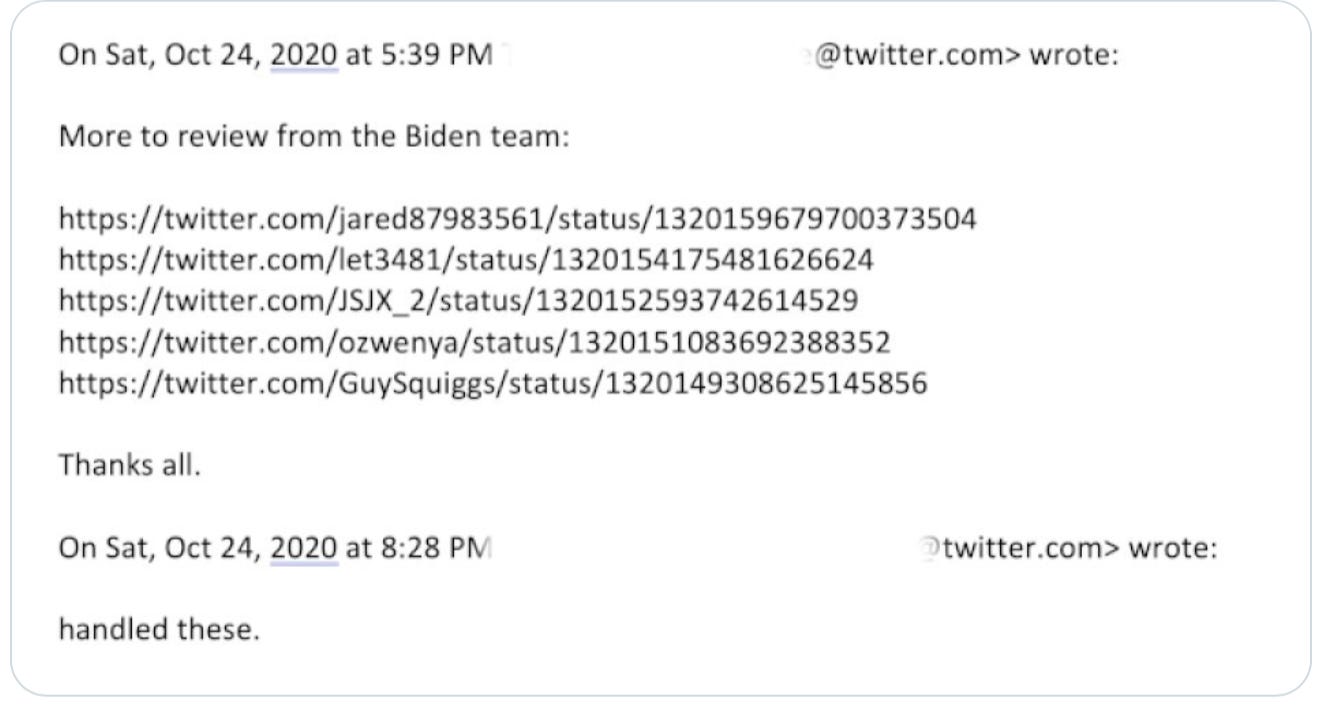 Taibbi also said records showed a direct link between Biden’s team (and other actors) and Twitter, including very specific requests for takedowns of particular tweets. Taibbi said requests from connected actors to delete individual tweets were ROUTINE. For example, Twitter executives would write each other, “More to review from the Biden team.” The response would be: “Handled.”