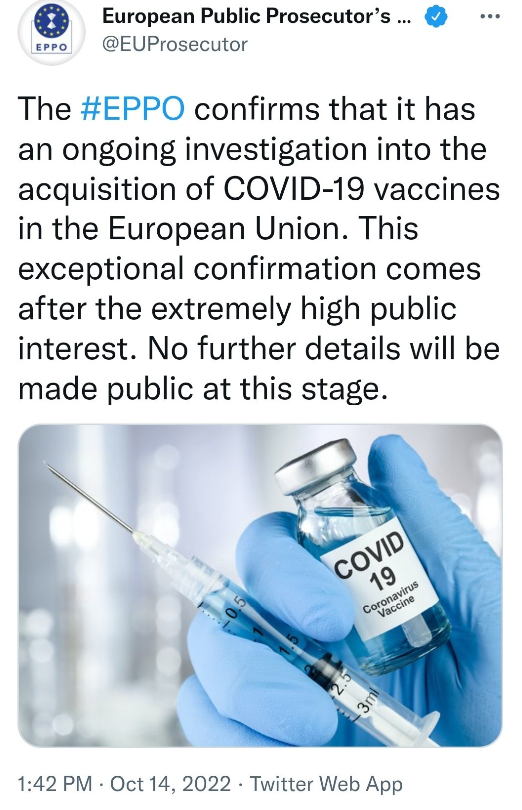 European twitterers commenting on the story are super excited because the EPPO has authority to get hold of the private messages between EU president Ursula Von Der Leyan and Pfizer president Albert Bourla, which Von Der Leyan has claimed were ‘accidentally deleted’ or ‘lost on her old phone’ or bleachbitted or something.