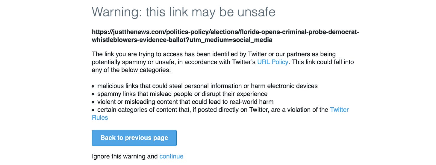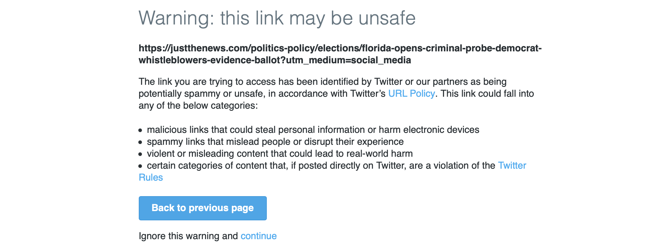 Within an hour of the Just the News story hitting Twitter, Twitter added a “Safety Flag” warning to the post, so that people who clicked the link to the ballot harvesting article would see THIS scary advice: