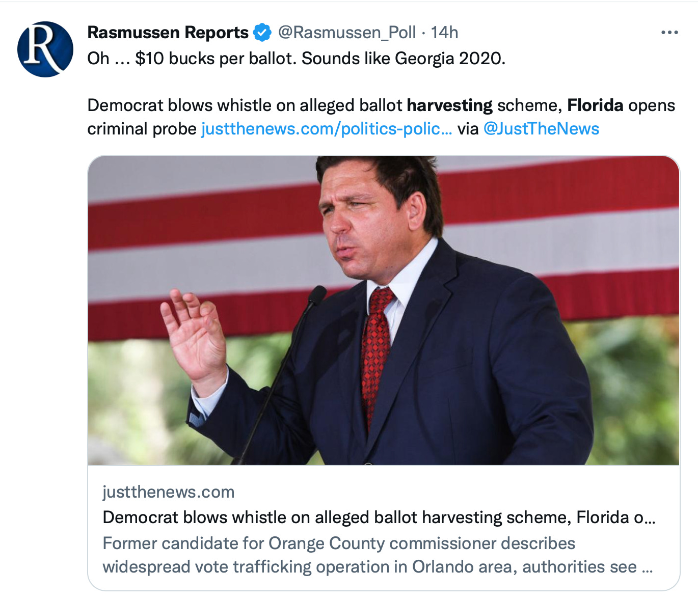 🔥 On Thursday, Just the News reported that Florida Governor DeSantis’ new election crimes unit recommended the state police open a full criminal investigation into an alleged long-running, widespread ballot harvesting operation in politically important, central-Florida African-American communities. The investigation arose from a Democrat whistleblower’s detailed complaint describing the harvesting scheme, which describes specific details, names names, lists amounts paid for ballots ($10 each), and so forth.