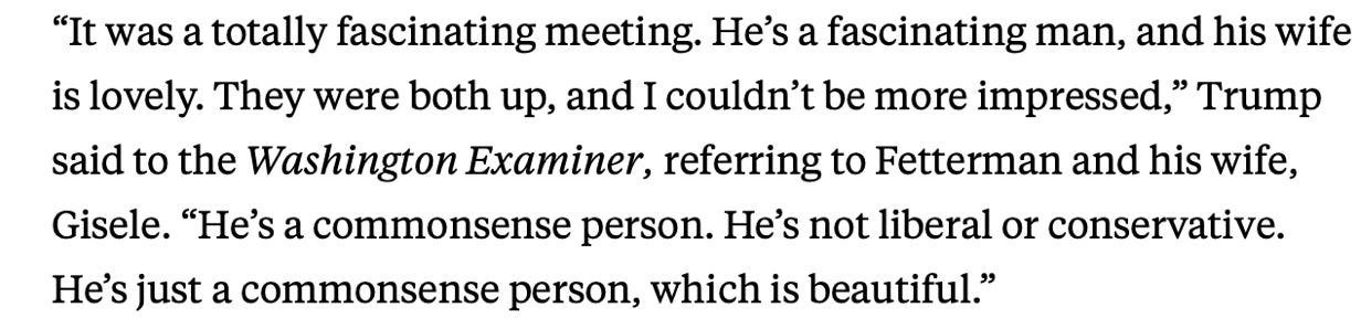 Details were oddly unavailable. None of the stories reporting Fetterman’s trip to Mar-a-Lago said precisely when the meeting happened. But apparently it was over the weekend. In any event, John Fetterman, who sponsored the Laken Riley Act, just became the first Democrat Senator since the election to meet with President Trump.