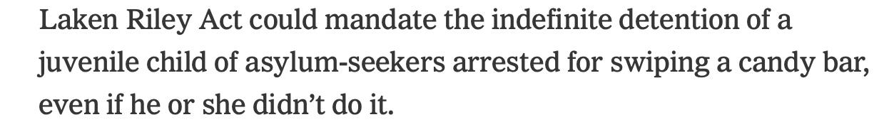 You’ll be forgiven for not knowing much about the Laken Riley Act. Like an overweight ballerina, corporate media has been ponderously balancing between talking enough about the Act to frighten low-information Democrats like Michelle Golberg, but also not talking about any of the Act’s particulars, since any sane American would instantly agree with the details.