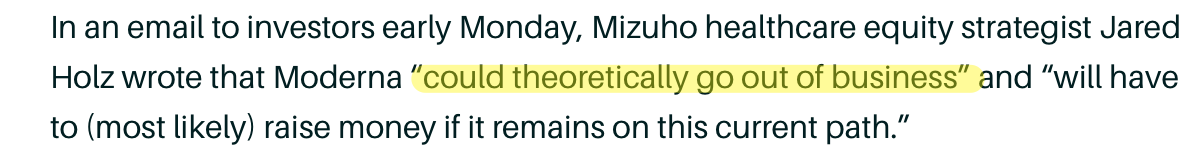 You saw it here: the first official media reference to the possibility that Moderna will slide back into the gory abyss out of which it originally crept.
