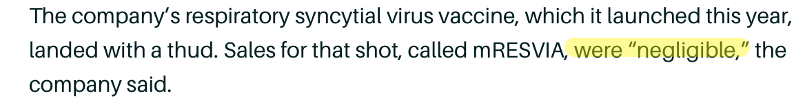 But wait! What about Moderna’s brand-new RSV shot?? It is the company’s only other product, just recently released under expedited FDA approval last year. What about that part of the pipeline? Moderna’s brand new drug? A whole new disease and a whole new market? Well, listen for the thudding sound…