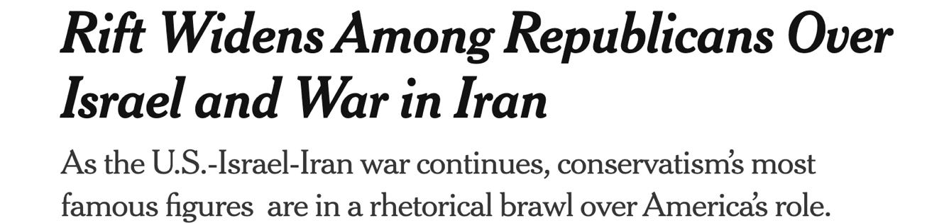 The tonal difference could not be more different. The New York Times’s front page ran a “MAGA Fracture” story headlined, “Rift Widens Among Republicans Over Israel and War in Iran.” The story’s gigantic cover photo platformed Tucker Carlson and Megyn Kelly, both of whom have called the Iran Operation a mistake, an Israeli influence operation, and the worst thing since the EPA mandated energy-efficient dishwashers.