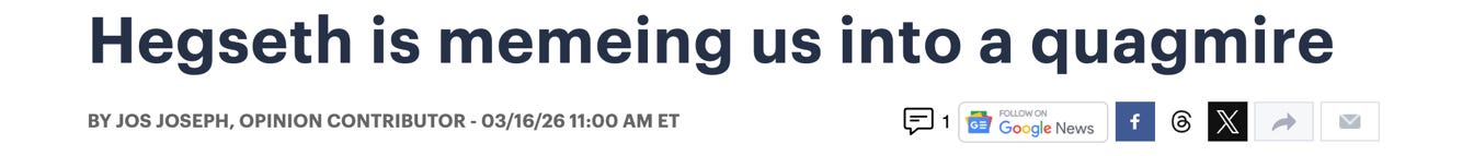 “Two weeks into Operation Epic Fury, the dominant narrative has settled into a comfortable groove: The United States and Israel stumbled into a war without a plan,” the story began. “Oil prices are surging, and the world is facing another Middle Eastern quagmire.” That’s it in a nutshell. The Hill, Monday, becoming a meme of itself:
