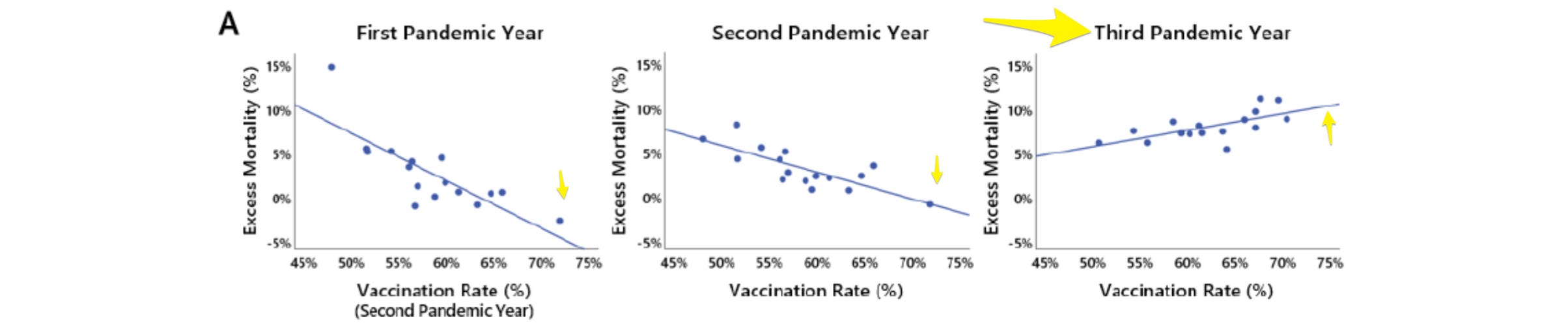 The scientists expected to see the “negative correlation” between jabs and excess deaths in years one and two. Other studies had already found the same thing, and the media has long trumpeted those studies as proof the jabs didn’t cause the excess deaths. But the scientists kept digging, and were surprised to find jab rates and deaths beginning to travel in lockstep starting in the third year. In their words: