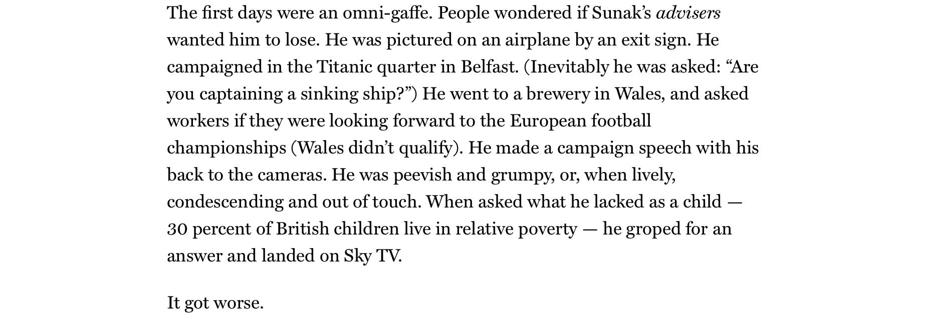 This morning, the Intelligencer ran its story headlined, “The End of the Tories—The Conservative Party’s hopeless, hapless campaign signals the conclusion of a misbegotten era.” The hilarious account of Sunak’s campaigning mistakes compared favorably to Biden’s debate disaster:
