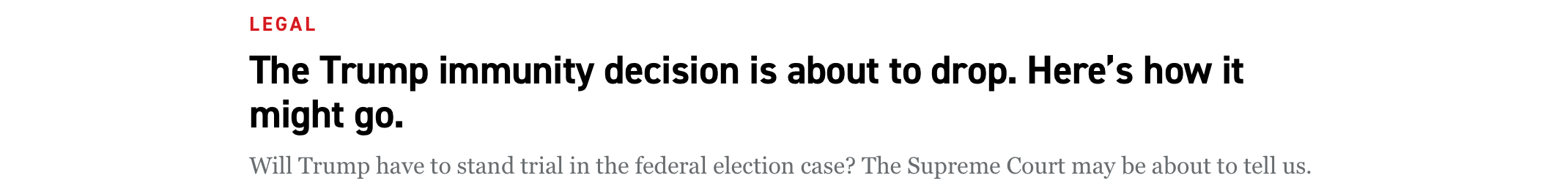 🔥🔥 Today will be a giant news day, if not another wild, 2024-style inflection point that changes everything, again. We await a massive, historic Supreme Court development. On Friday, Supreme Court Chief Judge Roberts announced that all remaining orders will be released today. Barring some unexpected development, those last five decisions must necessarily include the Trump Immunity Decision. Politico, this morning:
