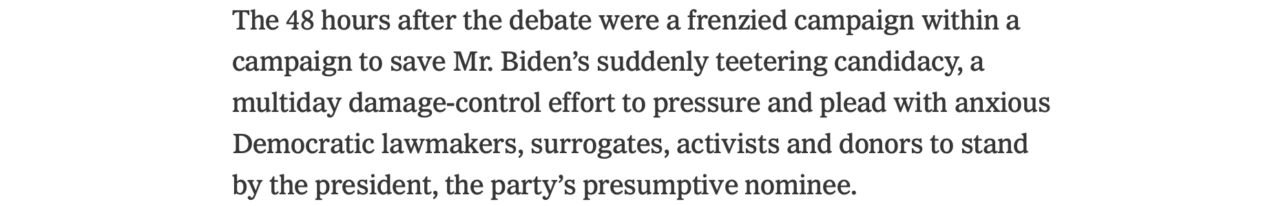 In a separate article headlined, “48 Hours to Fix a 90-Minute Mess: Inside the Biden Camp’s Post-Debate Frenzy,” the Times neatly described the panic and chaos that erupted inside the Democrat party even before the 90-minute debate had ended, calling it a “frenzied campaign within a campaign”: