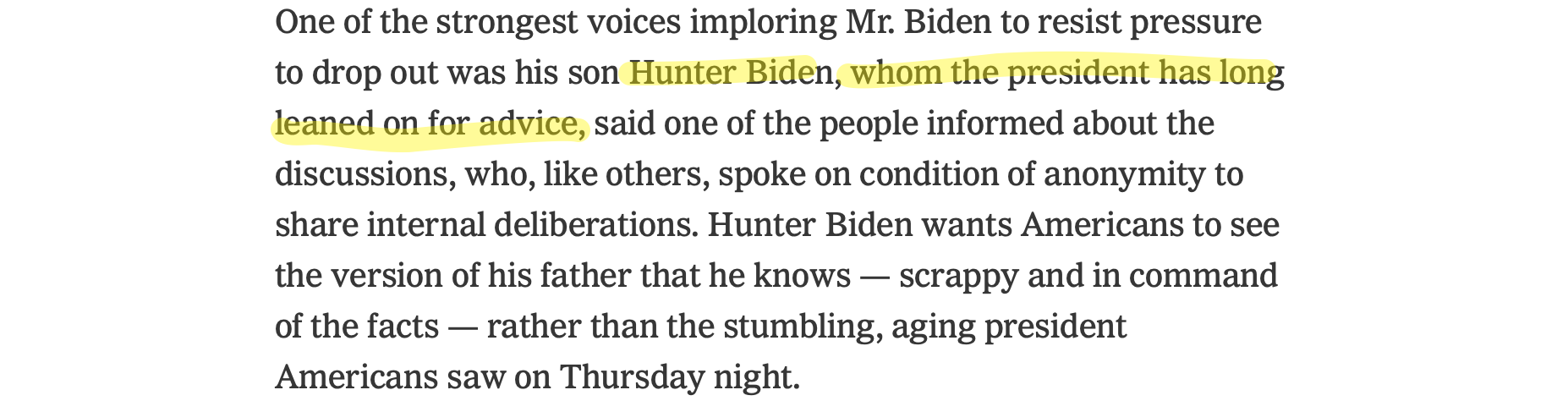 🔥🔥 Oh, boy. As if Biden’s Debate World Crisis could not possibly get any worse, yesterday the New York Times said, hold my beer and watch this. The paper’s descent into the bottomless pit of surreality was headlined, “Biden’s Family Tells Him to Keep Fighting as They Huddle at Camp David.” Just wait till you hear who they say most strongly suggested Joe should stay in the race. I promise I’m not making this up.