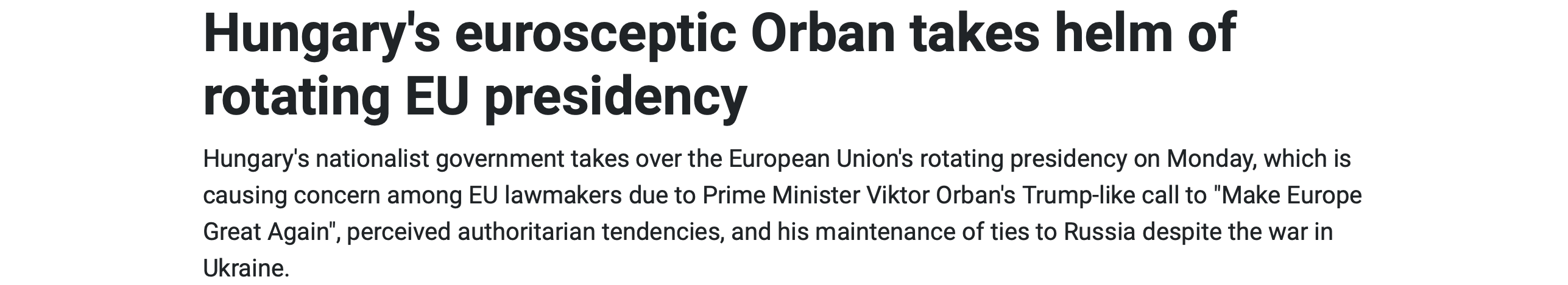 There’s lots more bad news for Biden and his neocons. For just one example, Hungary’s solidly anti-Ukraine, anti-immigration, pro-Trump Prime Minister Viktor Orban is taking his seat as the European Union President. His slogan? “Make Europe Great Again.” I am not making that up: